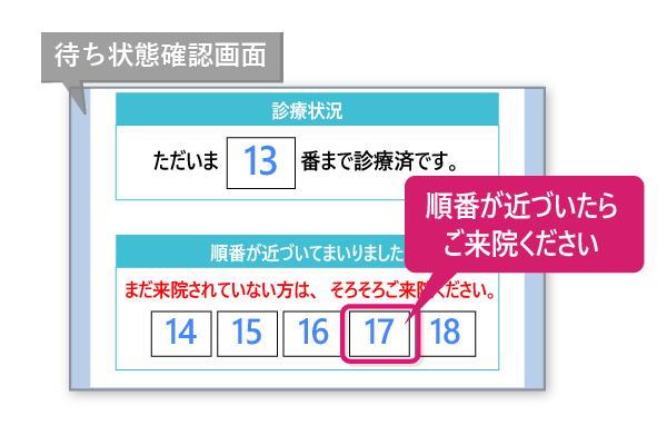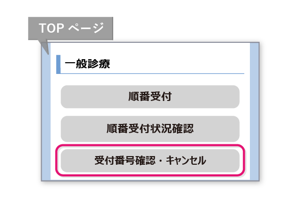 TOPページの[受付番号確認・キャンセル]ボタンをクリックして、診察券番号(仮番号)+誕生日(4ケタ)を入力で、現在の予約状況が確認できます。