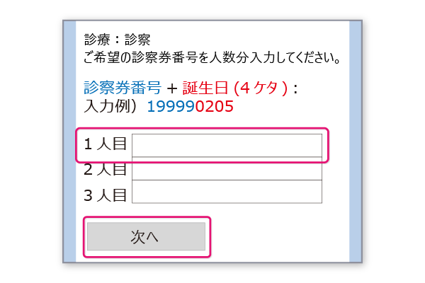 予約したい方の診察券番号(仮番号)+誕生日(4ケタ)を入力してください。