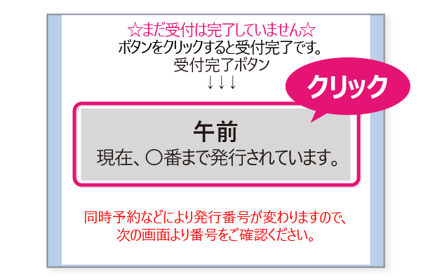 TOPページの[受付番号確認・キャンセル]ボタンをクリックして、診察券番号(仮番号)+誕生日(4ケタ)を入力で、現在の予約状況が確認できます。