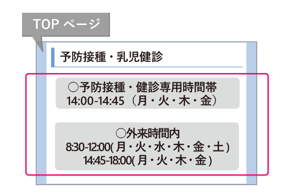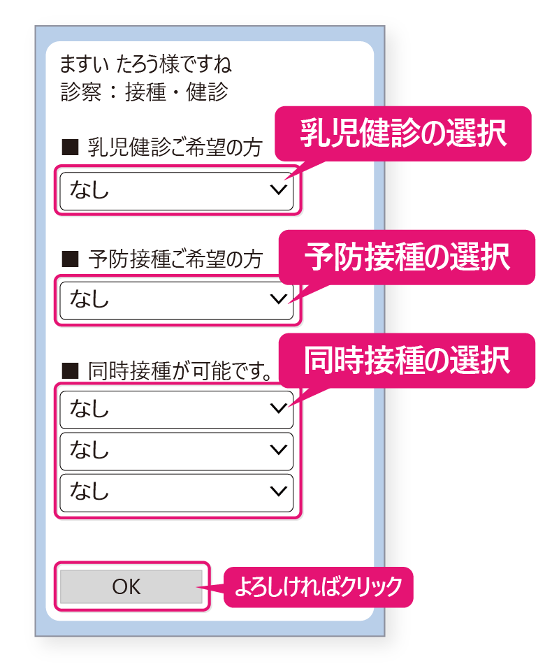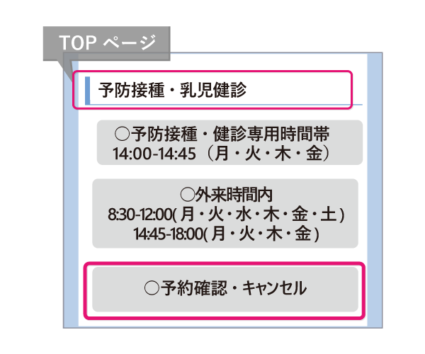 TOPページの予防接種・乳児健診の中の[予約確認・キャンセル]ボタンをクリックして、診察券番号(仮番号)+誕生日(4ケタ)を入力で、現在の予約状況が確認できます。